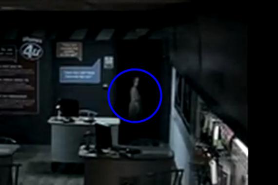 A spooky-looking female figure can be seen walking past a doorway at the back of the store, pausing to turn her head and look straight into the recording surveillance camera.