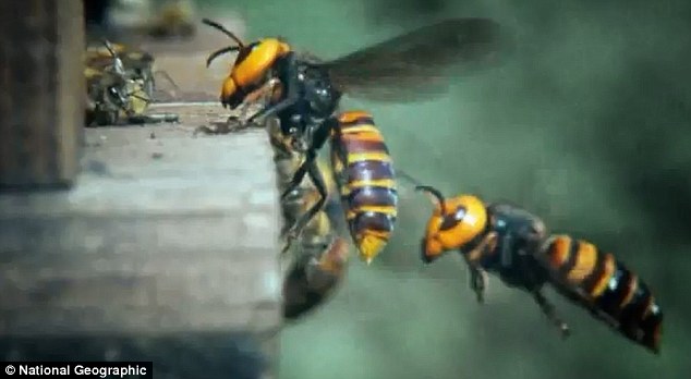 Massacre in the hive: Amazing footage of 30 giant Japanese hornets slaughtering 30,000 tiny honeybees to eat their young