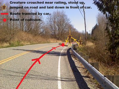 What I can add to her account is that later after much thought, she really felt that the creature waved it’s arms in the air and laid down in front of her car, to try to get her to stop. At the very moment the incident started she really felt it was a person in a suit pulling a prank on her. But she quickly became concerned about possible danger and feared for her child in the backseat, so she was reluctant to stop. Then as she got closer she realized it was not a person pulling a prank and was therefore not stopping for anything. Thinking that no one would take her seriously about a bigfoot when calling 911, she told them she thought she ran over a bear.