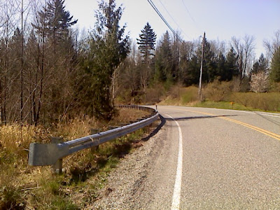 ENVIRONMENT: just after a bridge off and on a road going through very woody area with a creek just off the road down quite deep and a steep side, that’s why the guardrails were there.