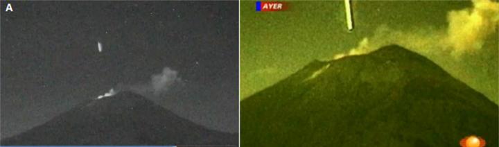 The CENAPRED’s camera at Altzomoni is located 11 kilometers from the Popocatepetl Volcano’s crater, and a few meters away from where the Televisa corporation has installed another camera on which similar images were recorded and rebroadcast on the “Noticiero con Joaquin Lopez Doriga” program on the night of Friday the 25th (Figure 1b). It should be noted that differences in shape, length, shadows and brightness between the images taken by the CENAPRED camera and the Televisa camera are related with technical aspects particular to each item of equipment, mainly their resolution. Moreover, the framing in the case of the CENAPRED images is much more open, while the Televisa camera is much more light sensitive.